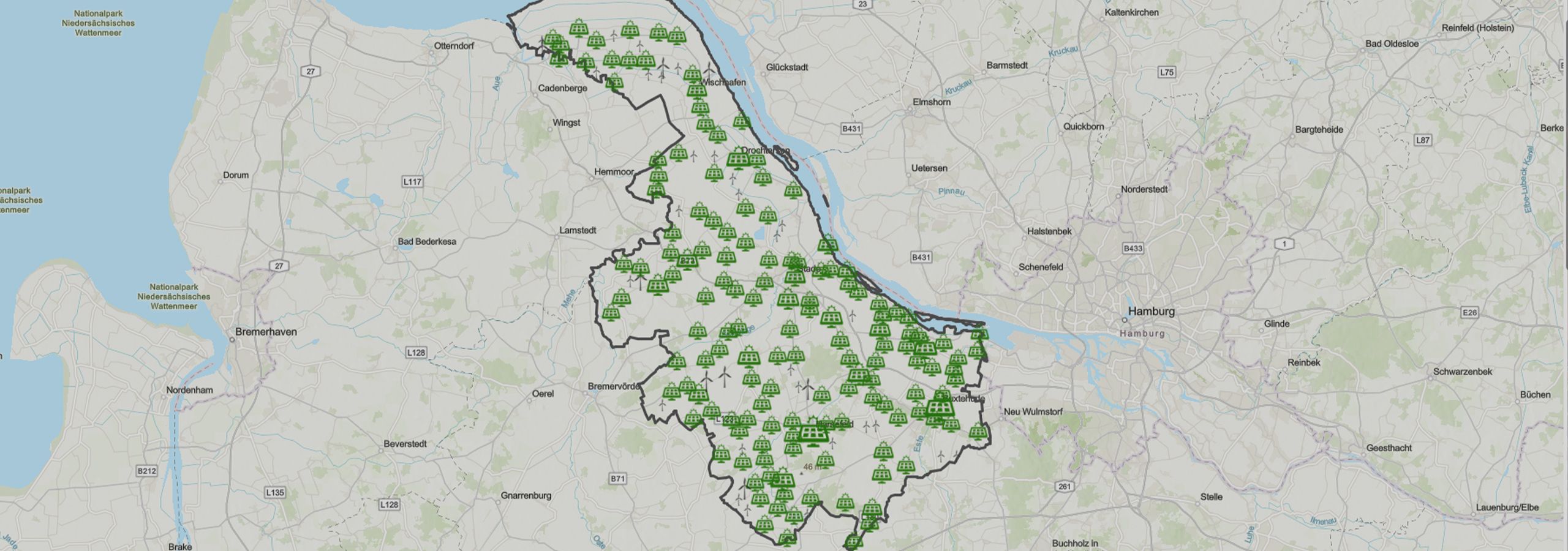 Die interaktive Karte der Klimawerkstatt im Landkreis Stade e.V. bietet eine übersichtliche Darstellung nachhaltiger Energieinfrastruktur in der Region.